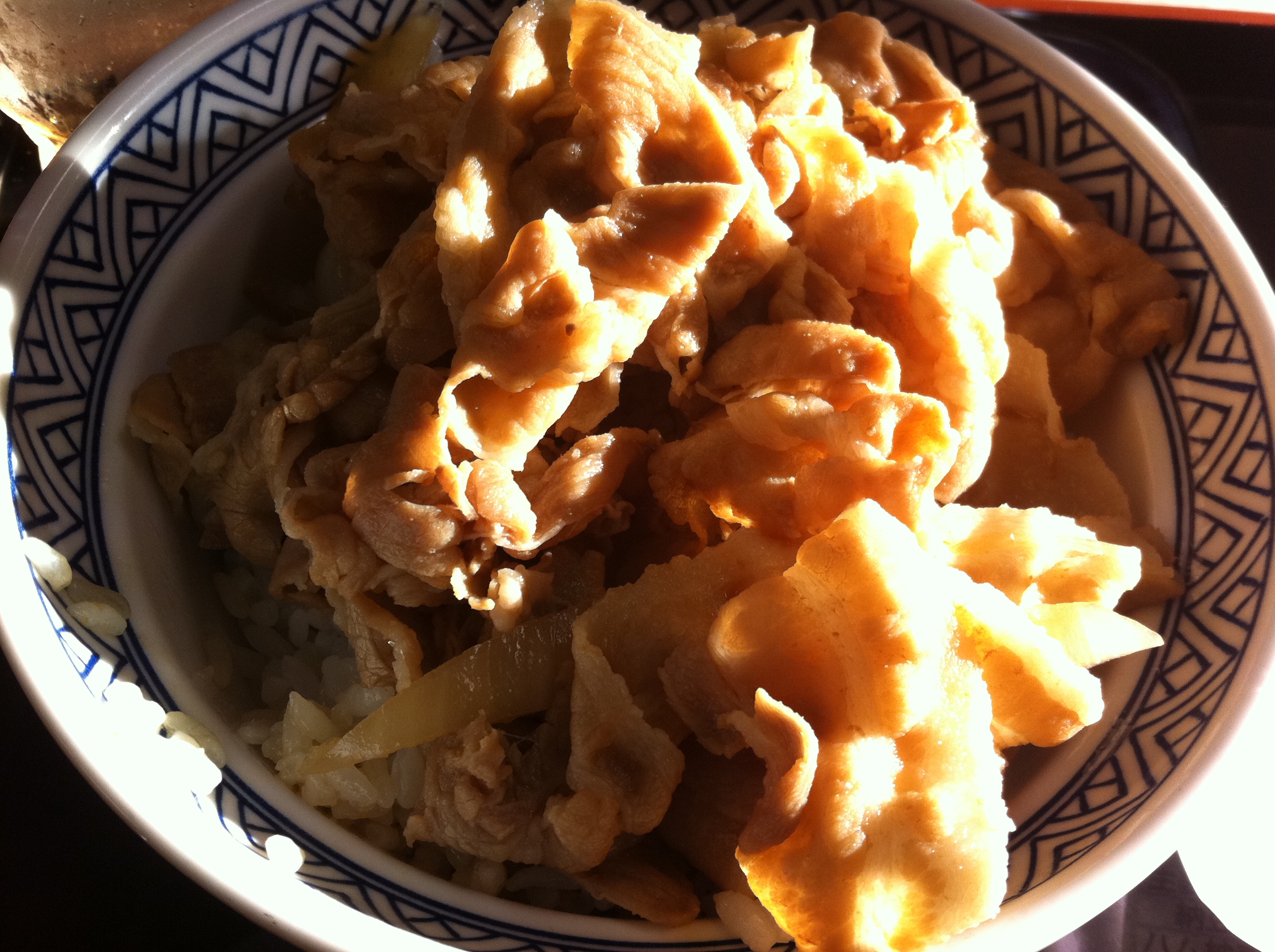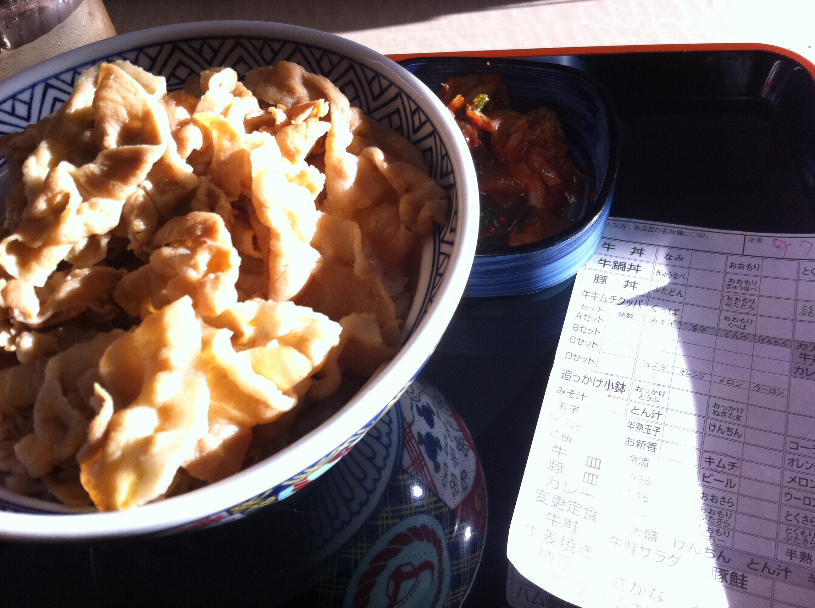 Zum Beispiel gibt es Gyudon – eine Schale Reis mit dünnen Scheiben Fleisch, die mit Zwiebeln angebraten werden und dann mit einer Soße abgelöscht werden und auf den Reis kommen. Simpel, aber sehr lecker. Dazu kann man noch kleine Nebenspeisen wie Kimchi oder eingelegter Chinakohl auf japanische Art nehmen.