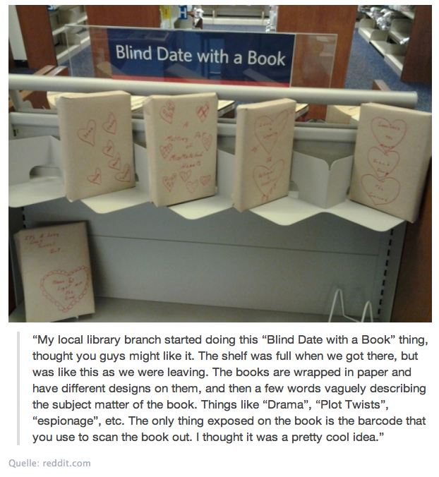 Auf der Seite reddit.com hat ein Bild einer Aktion in einer Bücherei das Aufsehen aller Bücherliebhaber geweckt. Den Büchereigängern werden Bücher angeboten, das ist nichts besonderes. Doch man weiß nicht welches Buch man sich holt, man lässt sich also auf ein Blind date mit einem Buch ein. Lediglich der Scan-Code auf derRückseite ist frei und auf der Vorderseite sind Hinweise auf den Inhalt zu finden – macht doch eh keiner? Derjenige, der das Bild online gestellt hat, musste sich einem fast leer geräumten Regal stellen – so gut kam diese Aktion an.