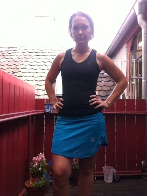 Ich stopf mich als in den Rock, der mit fast zu engen Tights und viel zu lockerer Taille seltsam wirkt. Mit den Laufschuhen und dem Oberteil komme ich mir echt vor wie eine Hardcore-Sportlerin, die gerne mal härter zulangt. Diese Kombi aus Muskelzeigen und Röckchen mit Blümchen Tragen ist skurril. Liegt eventuell auch daran, dass ich auch Muskeln habe und nicht so graziös geformt bin. Es ist auf jeden Fall eins: schön luftig!