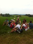 Der Sonntag war ein wunderbarer Sonnentag, heiß, schwül und mit blauem Himmel. Nicht nur waren deswegen die Flaschen bald leer, sondern auch die Energiereserven. Außerdem brannten meine Füße und ich war kurz davor barfuß weiter zu fahren. Sehr kurz. Aber von Rapha gab’s ungefähr bei Kilometer 52 eine Pause – inklusive Säften, Wasserkanister, Espressomaschine, Muffins und und und. Während die Berge von Gewitterwolken langsam umhüllt wurden brannte uns die Sonne auf die Köpfe, Salzkrusten im Gesicht wurden mit viel Lachen als natürliches Peeling akzeptiert und ich hätte mir am liebsten eine Cola-Infusion gelegt. Ohne Cola ist das aber schwer, daher gab’s süße Fruchtschorle und Schoko-Muffins. Und viel viel Wasser. Natürlich mussten hier wieder Gruppenfotos her, Pippi-Pause hinter der Scheune war auch angesagt („Ich würd da jetzt nicht hinter gehen. Ne, würd ich nicht.“ wir so zu den männlichen Kollegen, die das Event grandios mitorganisiert haben.) und mein Knie musste ein bisschen gereinigt werden.