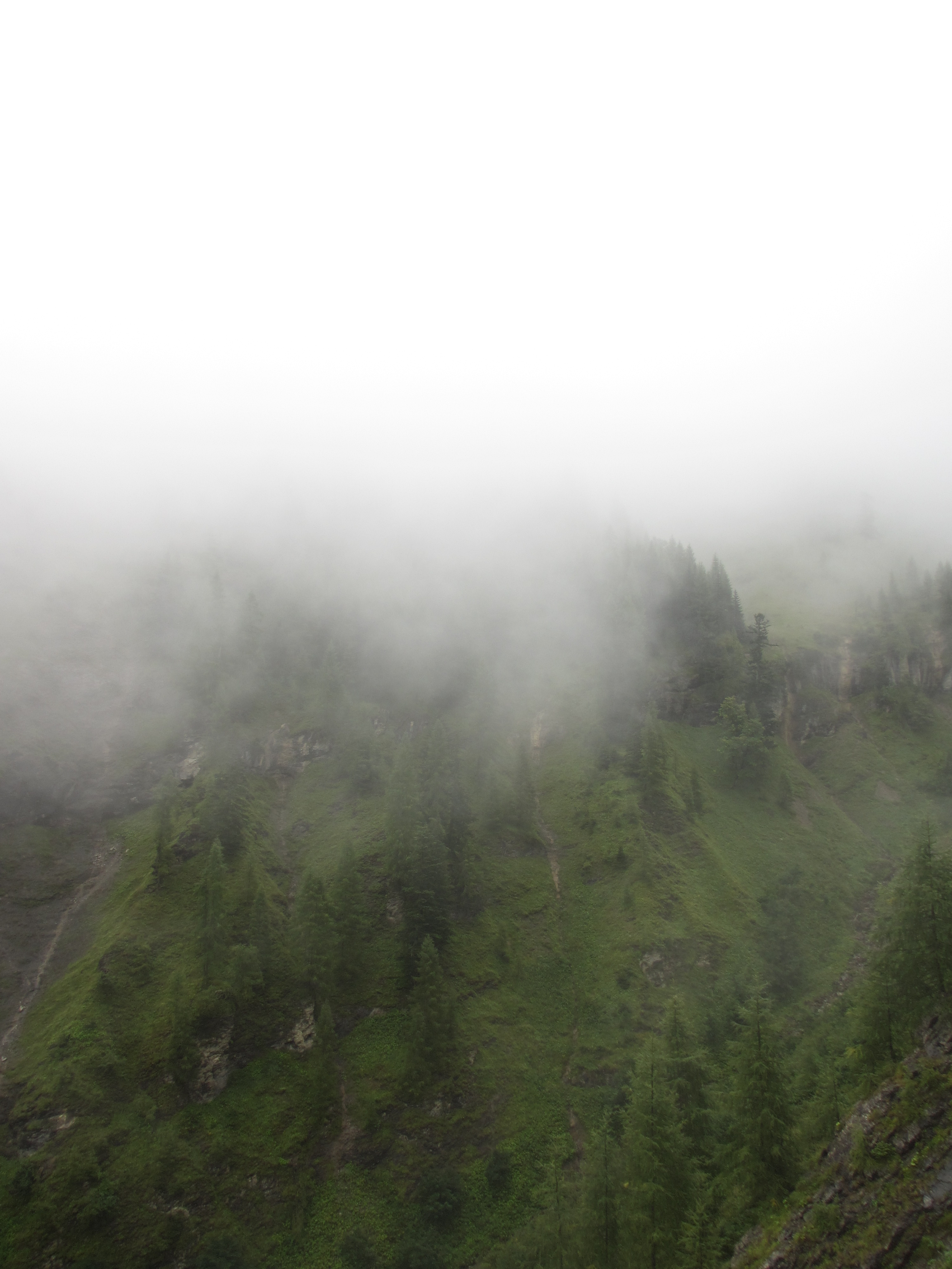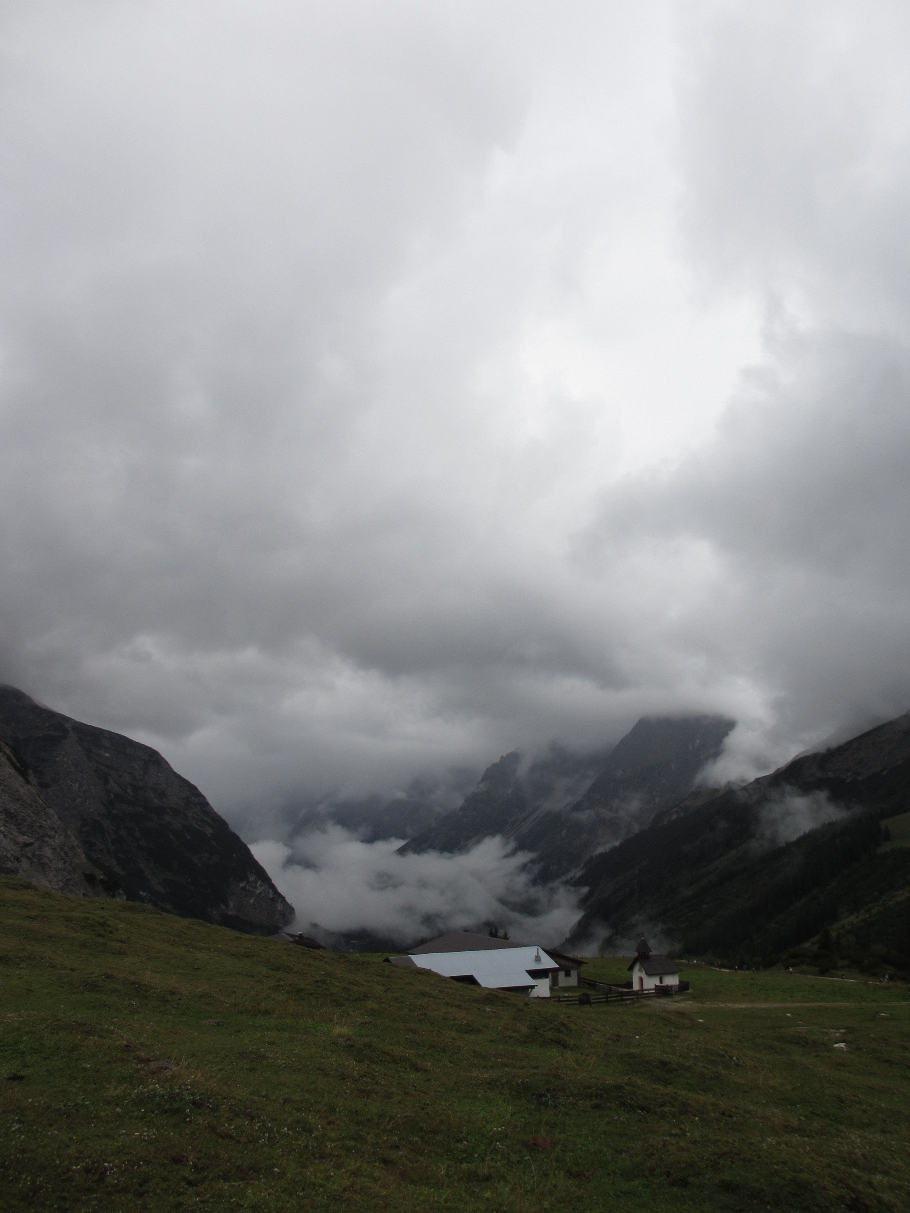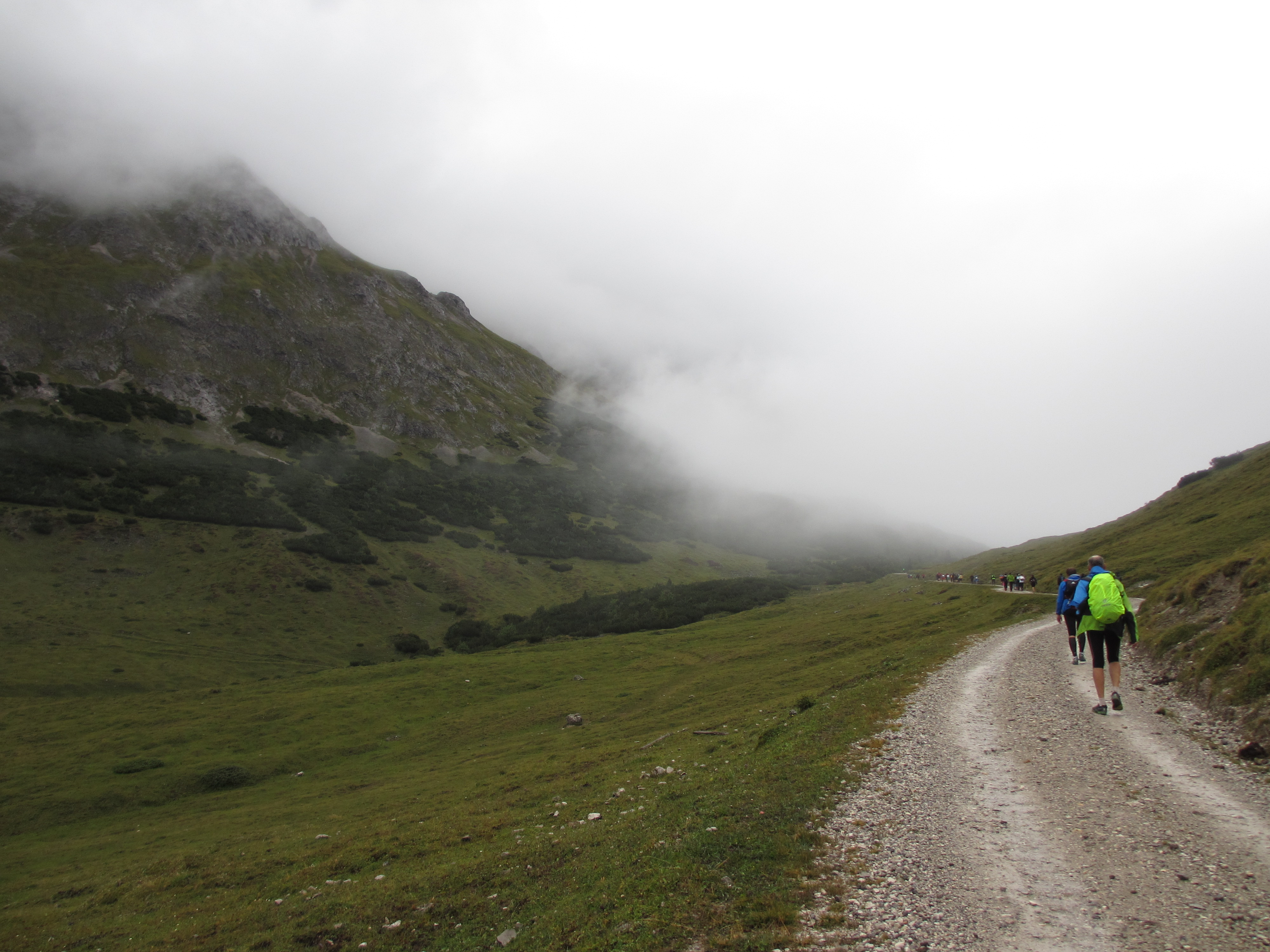 Und so japse, keuche und stöhne ich hoch. Hoch, höher, Falkenhütte. Die steht komplett im Nebel gehüllt und aus dem milchigen Wolkendunst läuten die Kuhglocken und hört man das entfernte Muhen der Kühe. Alles liegt im Nebel, man kann erahnen wo die anderen Läufer sind, aber die Umgebung könnte überall sein. Mystisch und seltsam unecht scheint das. Bei der Falkenhütte gibt’s dann wieder Brotzeit und der Regen wird wieder stärker. Sagte ich schon, dass es fast durchgehend regnete? Es sei denn Nieselregen zählt nicht als Regen sondern Luftbefeuchtung. Alles klebte, alles war durchnässt.