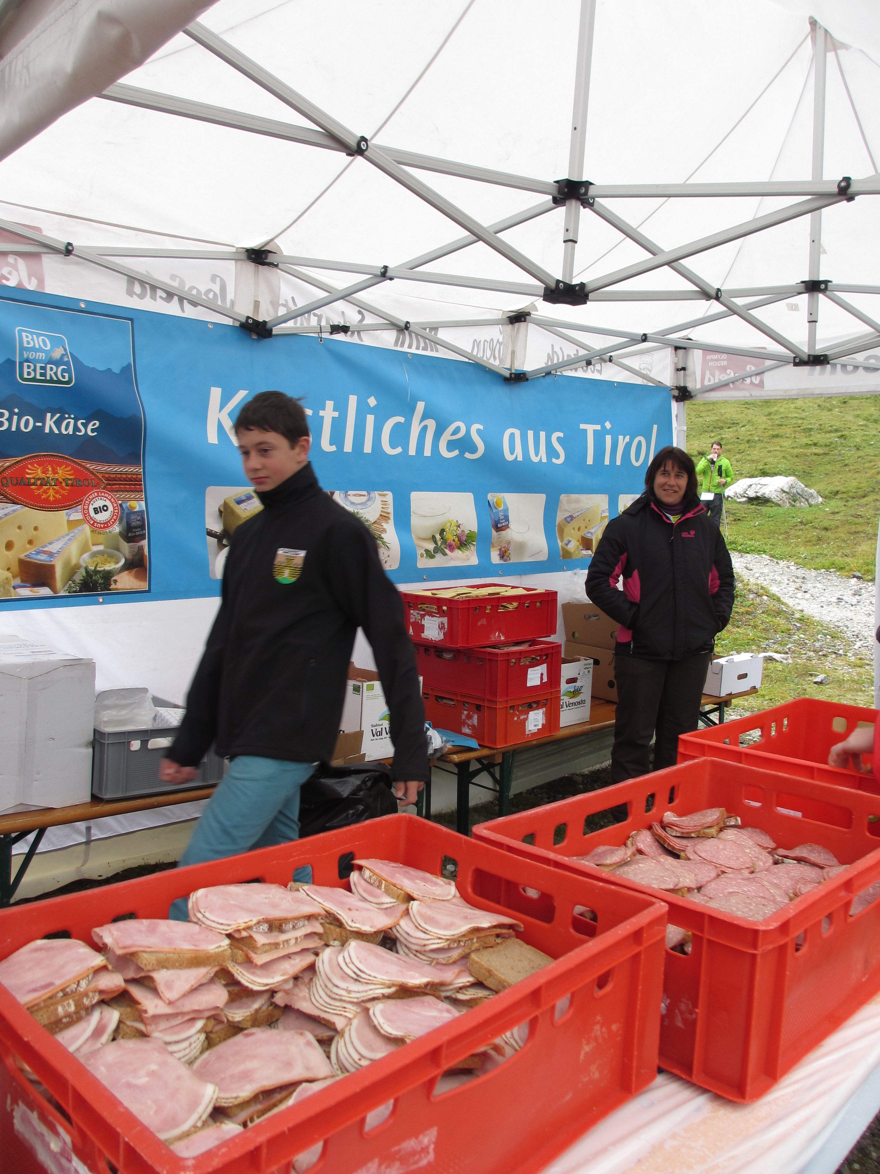 Während wir uns dann die Serpentinen zum Karwendelhaus hochschraubten, obwohl ein Stein sogar bergauf schneller rollen würde als ich gehe, kamen die Berge immer näher und wurden klarer. Mein Hunger hatte wohl angefangen Teile von meinem Hirn zu verdauen, denn in meinem Kopf hörte ich nur noch Wikinger Musik. Bis zum ersten „richtigen“ Verpflegungsstand. Mit WURSTBROTEN UND KARTOFFELSUPPE und KÄSEBROTEN! Ach war das toll. Futtern ohne Ende, Trinken soweit es ging und unglaublich motivierende Kommentare einstecken: