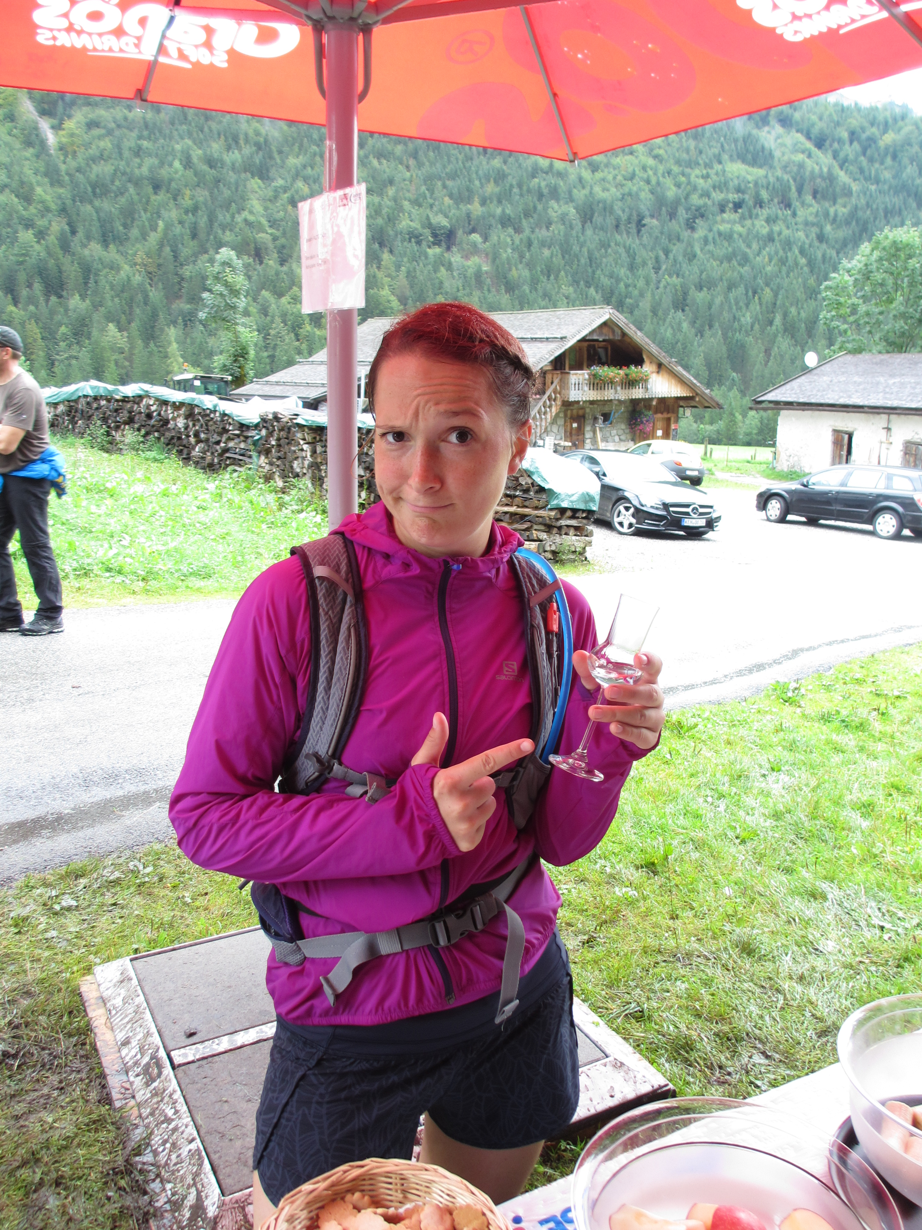 Nur noch runter? Ha ha ha. Haaaa. Nach einer Toilettenpause, hey, 42km ohne Klo obwohl ich gefühlte 12 Liter getrunken habe plus 4 Liter durch Nebeleinatmen aufgenommen habe, ging’s leicht abschüssig weiter. Aber meine Füße waren müde. Ich auch. Müde müde nass. Und so kam es, dass bei Kilometer 48 ein Obstler her musste. Mit dem Ziel in eben dieses zu fliegen.