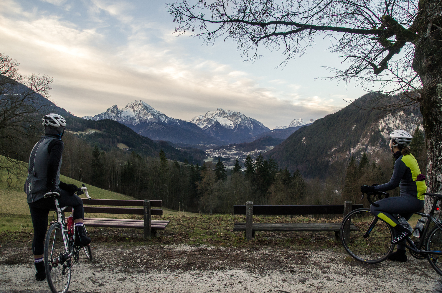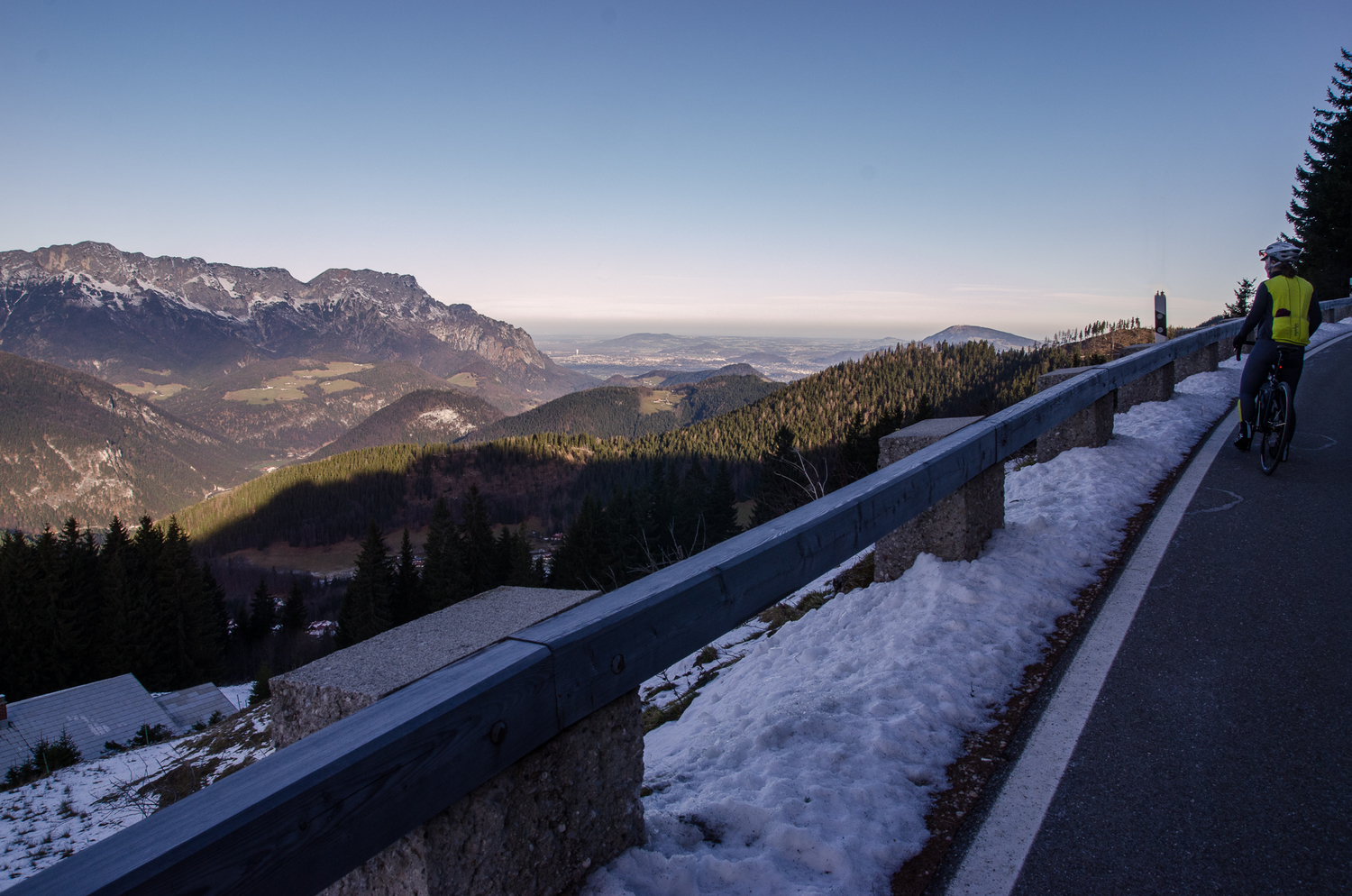 Mein erster Berg. Mein erster richtiger Anstieg auf dem Rad. In Gedanken bin ich schon ein paar Mal gestorben, hab meine Beine zumachen gespürt und den Druck der anderen mitbekommen, da ich ja so langsam war. Oh herrje, mein erster Berg. Ich hieve mich die minimalen prozentualen Steigungen hoch und da, plötzlich, steht der Watzmann. Und das Hieven war auf einmal ganz ganz leicht, nur die Lunge, die funktionierte noch immer auf Hochtouren, aber das war garnicht so arg wichtig. Die zarte Schneekuppe auf dem legendären Watzmann war viel wichtiger. War ich nicht deswegen hier, mit diesen zwei unbekannten und verrückten Jungs? John bleibt stehen und schaut ins Tal, nach Berchtesgaden. Ich klicke auch aus und atme tief ein, meine Lungen brauchen das. Boban zückt seine Kamera, fängt wie immer Momente ein. Es ist 8 Uhr morgens, die Sonne ist gerade aufgegangen, wir bewundern den Watzmann und vor uns liegt die Rossfeld-Panoramastraße. Mein erster richtiger Anstieg, mein erster Climb.