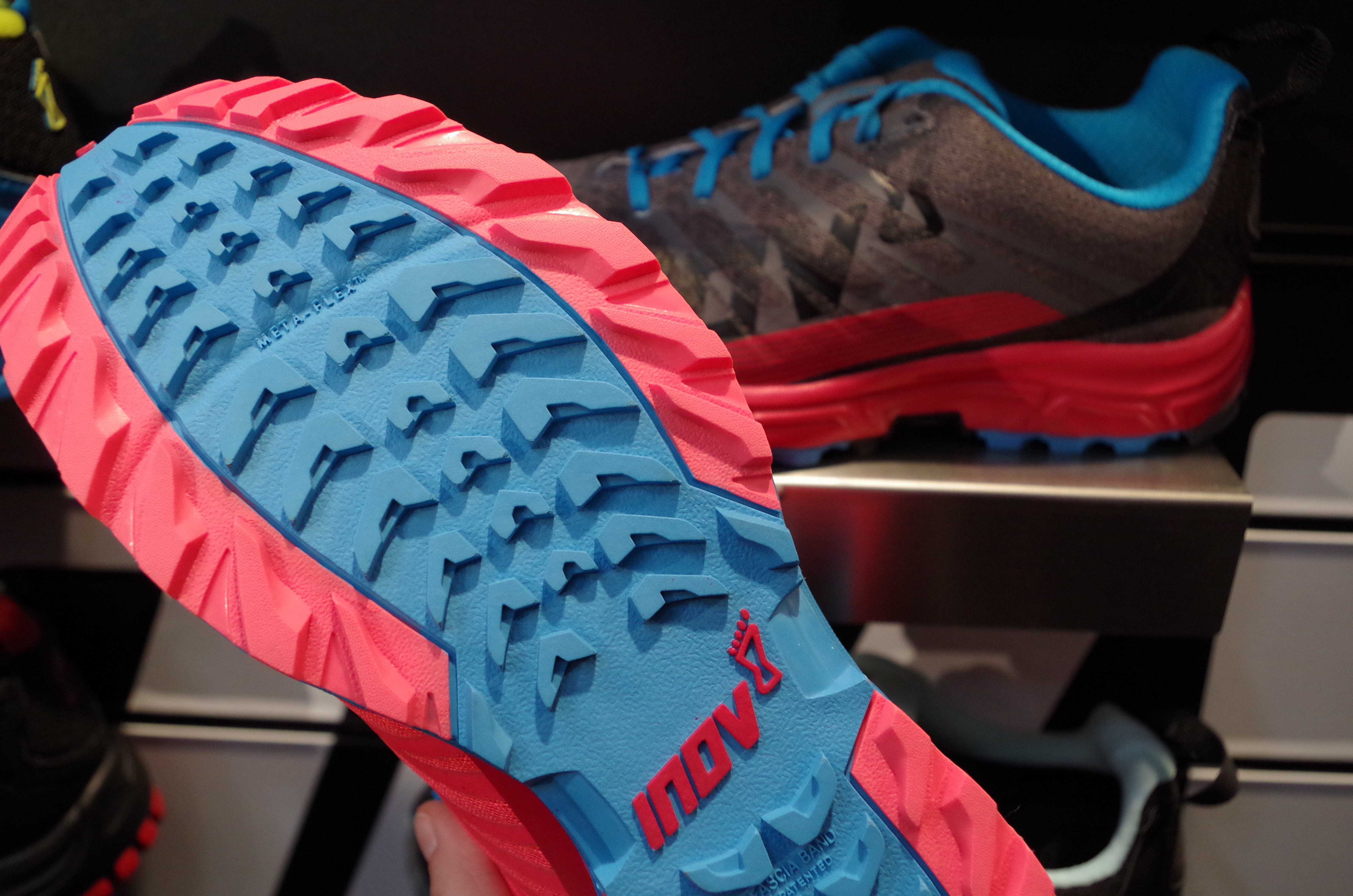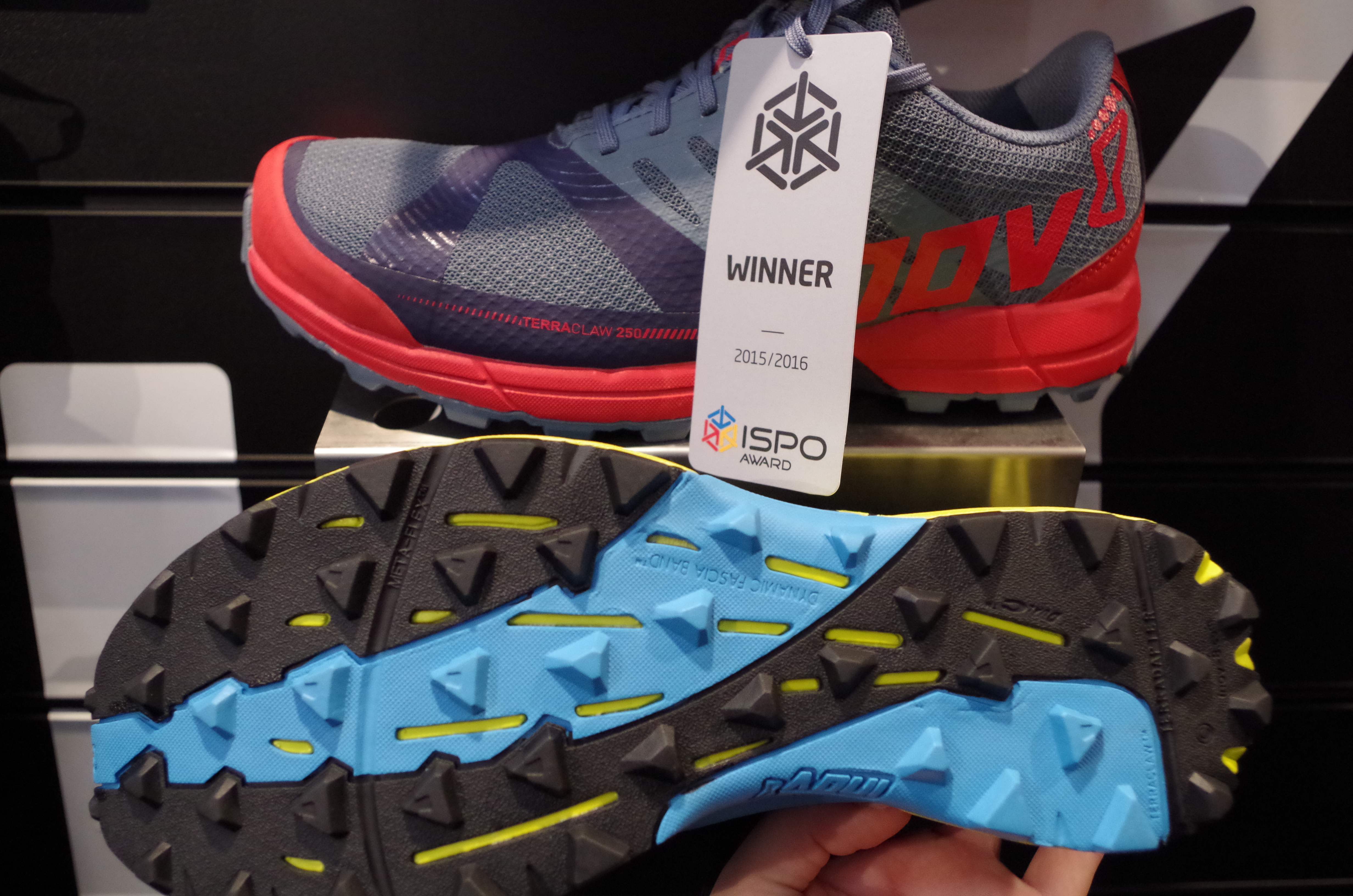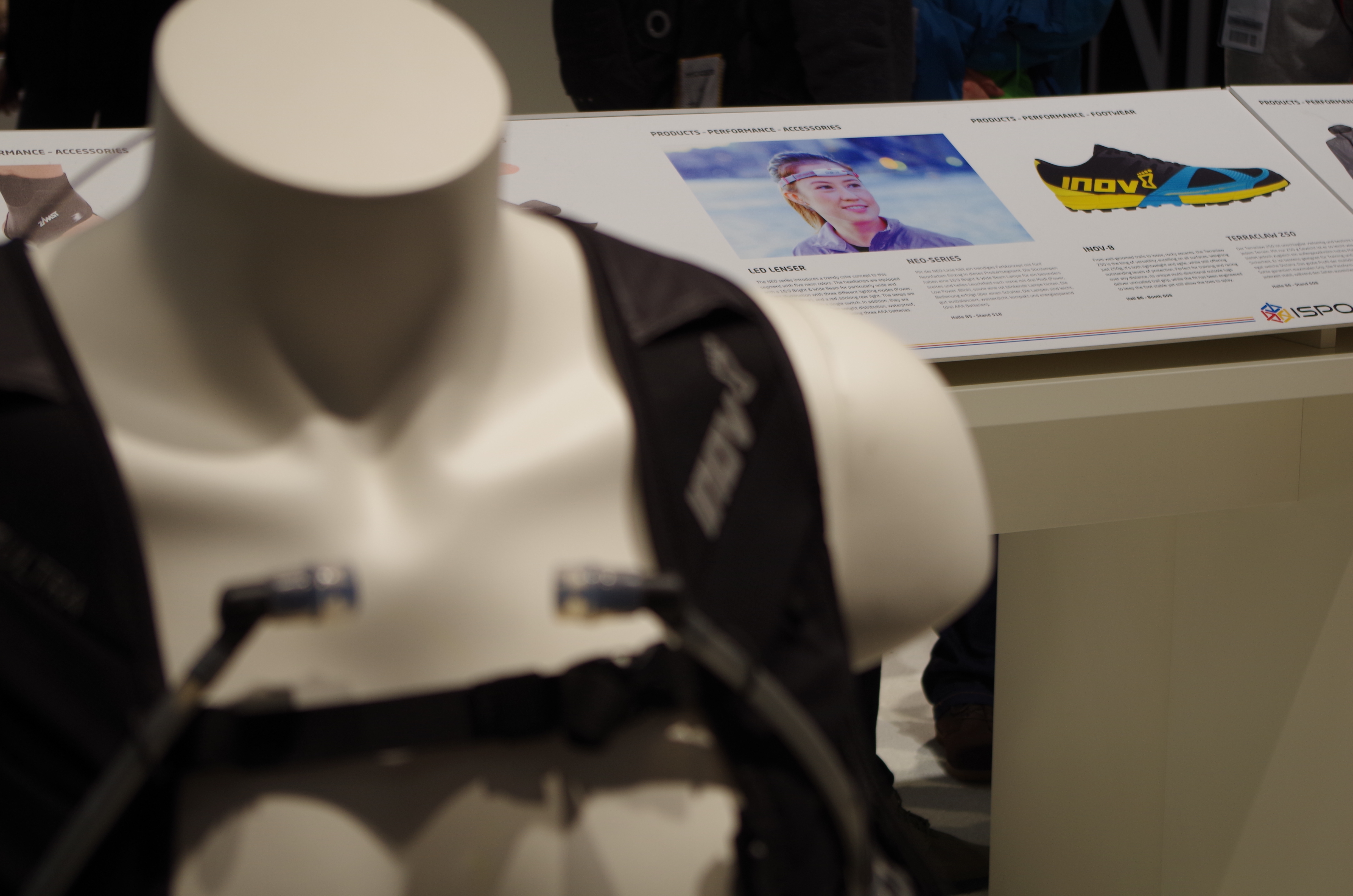 Deswegen: Hallo geliebtes Inov-8. Derselbe Stand wie letztes Jahr und wieder war Chris vor Ort, diesmal hat er mir nicht vom Lake District vorgeschwärmt – da ist nämlich Inov-8 angesiedelt. Schlimm sowas, da muss man raus und die Produkte live und sofort testen. Da Inov-8 auch dieses Jahr wieder bei den ISPO Awards so richtig abgeräumt hatte, 4 Auszeichnungen, gab’s einiges zu bewundern.