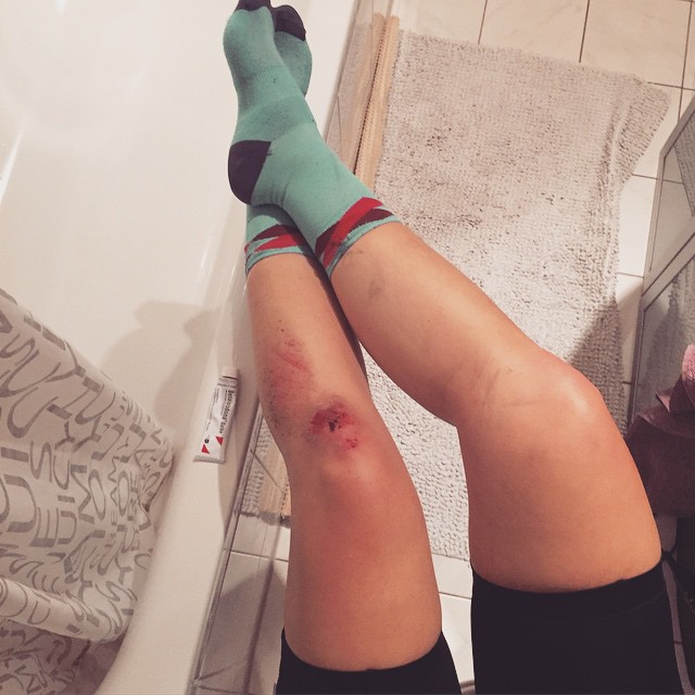 Meinem Rad geht es gut, das habe ich zitternd nach dem Aufrappelm vom Asphalt gleich überprüft. Das linke Bein lustig unkontrolliert wabbelnd. Schalthebel verkratzt, das Lenkerband muss wahrscheinlich neu drauf. Aber es hätte für mich auch schlimmer ausgehen können, als „nur“ ein pochendes und blutiges Knie. Für solche Fälle ist das ID Armband da.