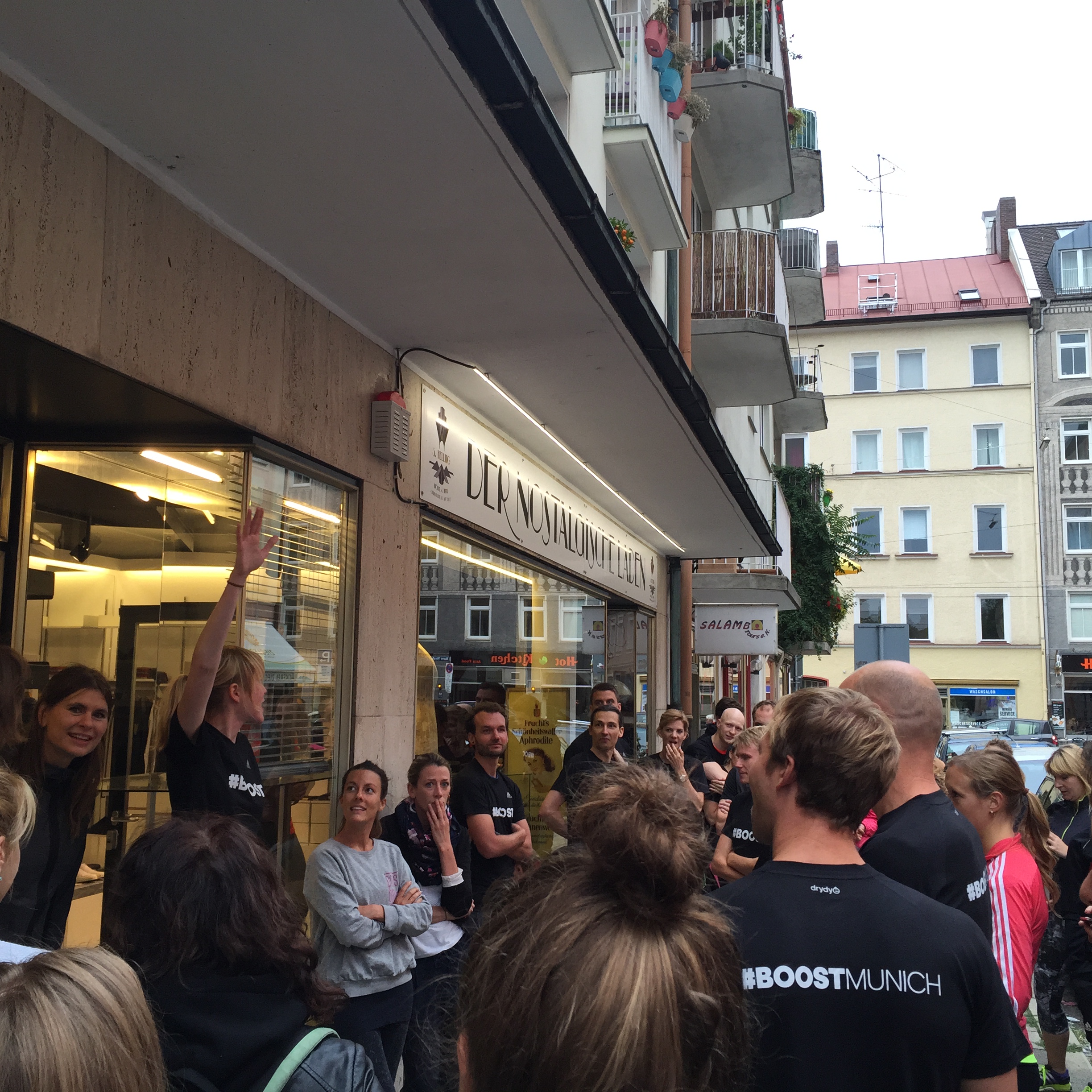 In München gibt es die Vee, die kümmert sich als Citymanagerin Running darum, dass #boostmunich nicht nur starten konnte sondern weitermacht. Die Idee ist ganz simpel: Wer jemanden kennt, der mitmachen will, der wird zur geheimen Gruppe eingeladen und weiß dann immer Bescheid, wenn ein Lauf ansteht. Und wo die Homebase ist. Und wie man sich so einen der knackig-bunten Ultraboost-Schuhe sichern kann.
