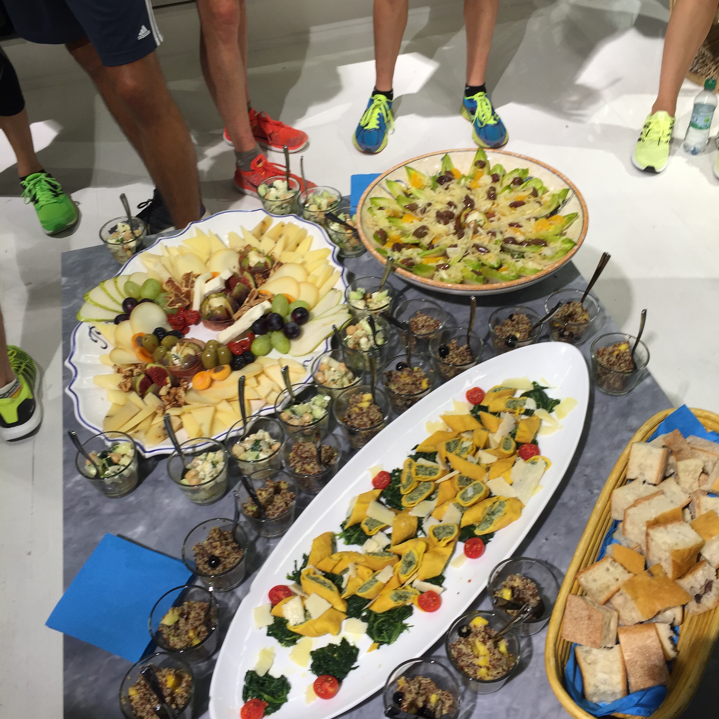 Nach dem Lauf ist ähm vor dem Futtern? So ungefähr. Es gab auf jeden Fall köstliches Fingerfood, mehr speziell als bekannt, aber die Rote Beete mit Trüffelcreme dazwischen… ja, nicht übel. Der Quinoa-Salat oder der Kichererbsen-Zucchini-Salat oder die Ei-Rolle waren auch nicht übel, aber ich hätte ja mal garnichts dagegen gehabt, wenn wir in der bayerischsten Stadt des schönen Bayern als #boostmunich Gruppe auch im Stil von #boostbavaria „gscheide Schmankerl“ haben. Aber wie ich meinte: Als „urban runner“ ist man minimal hipster, da darf das Trendfood Quinoa nicht fehlen 😉 .