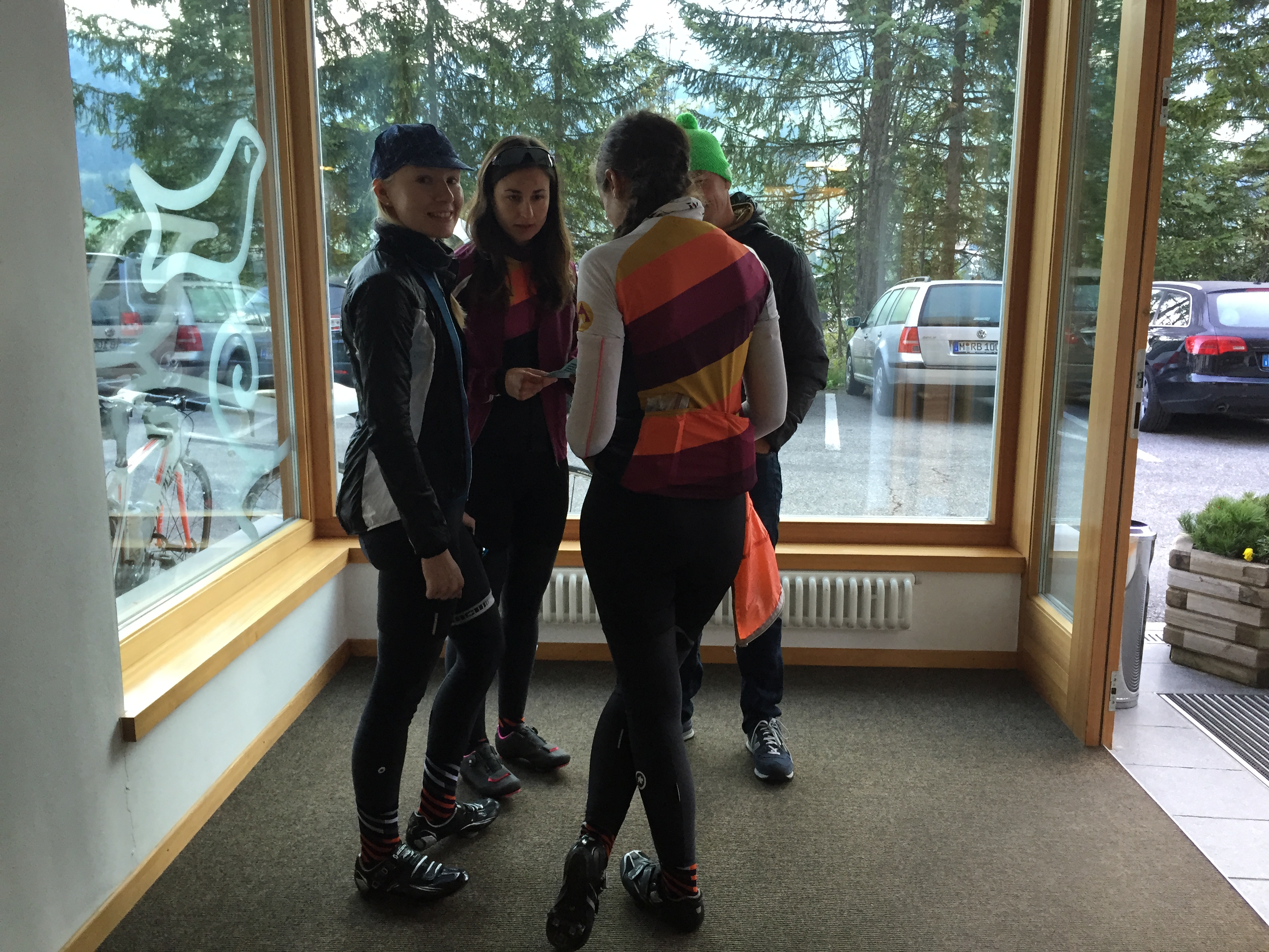 Madeleine schaufelte sich am Frühstückstisch wach, ich bekam nichts runter. Dafür packte ich einen Riegel nach den anderen ein und meine Westberg-Gels. Beim Treffen im Hotel hatte ich dann allerdings im Trubel mit den ungefähr 72 anderen Mädels und Begleitpersonen noch Zeit ein paar kleine Kuchen zu essen. Ich sah ein paar bekannte Gesichter, dann stand das „Captains Meeting“ an. Warum ich Captain war wusste ich nicht, ich hatte das Ding organisiert und war daher wohl auch für alles andere verantwortlich. Nun gut, wenn der Captain Schlußlicht sein darf, warum nicht. Unser Team startete jedoch nicht als letztes sondern als drittes. Auf die Räder, fertig, los! Und der strahlende Sonnentag in den Dolomiten konnte beginnen.
