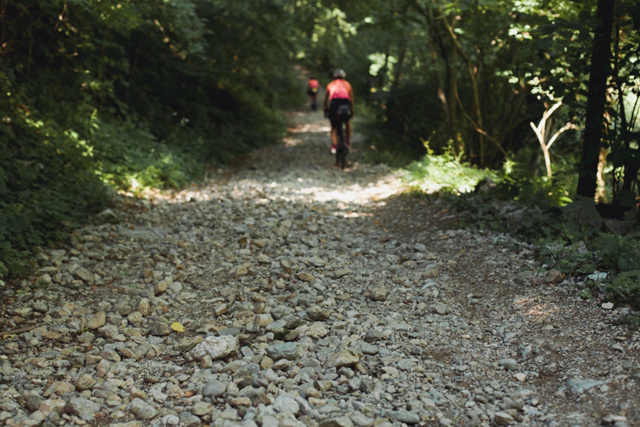Wir folgten dem Fluss noch auf Asphalt, bis es dann weg von der Straße auf Schotterwegen ging. Und man muss dazu sagen, dass slowenischer Schotter eine Nummer für sich ist. Je breiter die Reifen desto besser. Und je sicherer man auf dem nicht gefederten Rad ist, desto schneller kann man durch den losen und sehr groben Schotter pflügen. Aber sogar ich wünschte mir erstens Handschuhe (schwitzige Hände beim Bremsen) und zweitens Gabelfederung. Also zumindest ein bisschen. Aber wir sind ja hier nicht auf nem Wunschkonzert, also Zähne zusammen (wortwörtlich) und du-hu-hu-rch-wa-ha-ckel-ln-la-ha-ss-n!