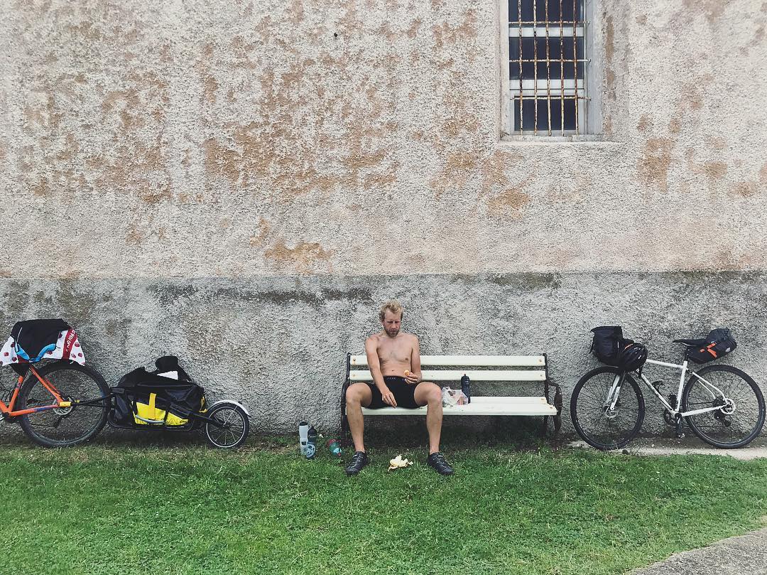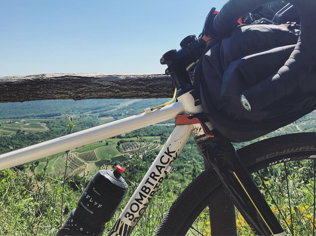 Ich war wie beim Ortlieb-Slowenien-Trip mit dem Testrad von Bombtrack unterwegs und hatte alles, was ich brauchte in zwei Radtaschen dabei. Leider keinen Ersatzschlauch, denn der war im Ortlieb-Bus gelandet. Aber ein Pannenset kann auch in der brütenden Hitze, umgeben von kreischenden Zikaden Wunder wirken.