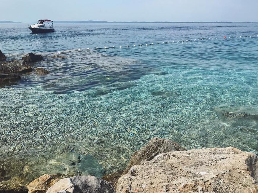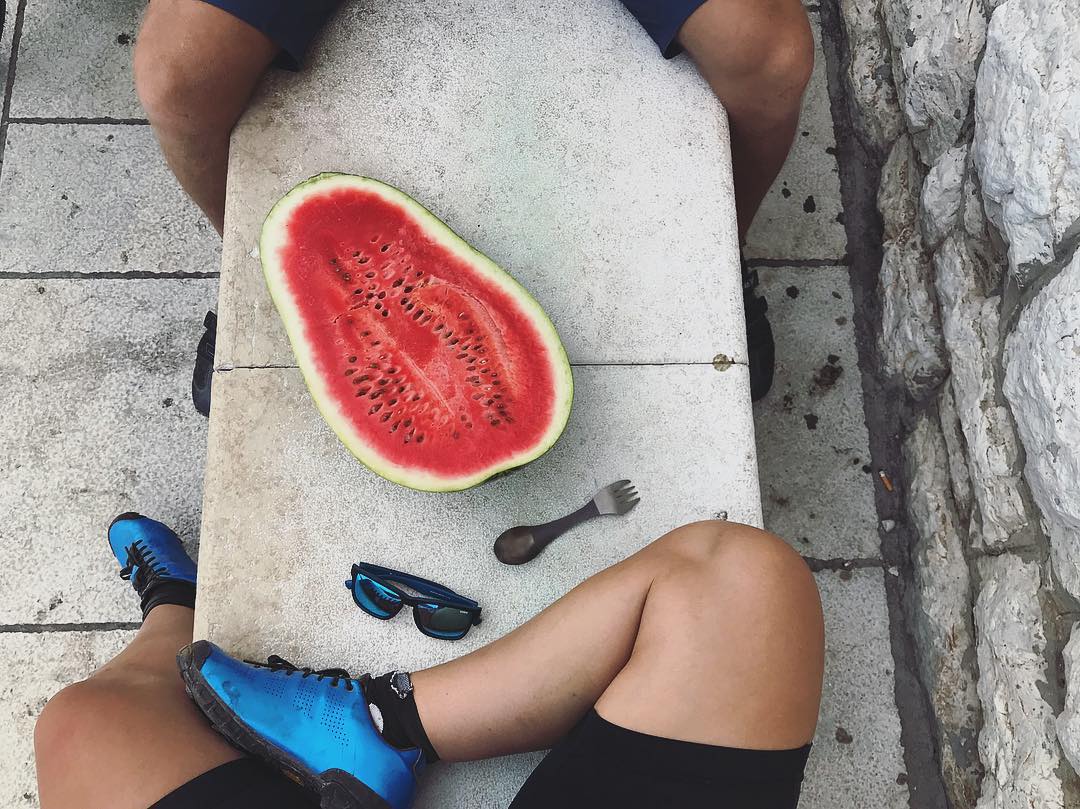 Am Meer entlang führte der Weg uns über Landstraßen, Schotterwegen und wenig Verkehr, sodass wir in flimmernder Hitze Mittags in Rovinj waren. Da musste erst einmal eine Wassermelone und Eis her. Wir entschieden uns einen Tauchplatz als Rastplatz zu verwenden und hüpften fröhlich mit anderen Badegästen dort ins kristallklare Meereswasser. Baden, Schlafen und Essen kochen am Nachmittag. Ein entspannter Tag am Meer.