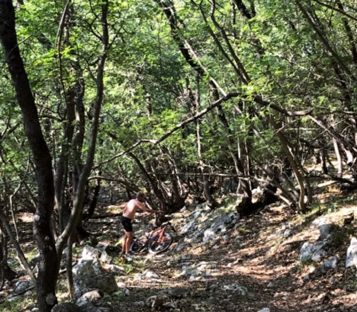 Mit der Fähre kam Cres innerhalb von 30 Minuten näher und dort angekommen befragten wir Komoot, wo wir denn nun hinsollten. Es gab zwei Campingplätze: Einer auf der anderen Seite der Insel und einer in Cres, der Hauptstadt der Insel. Das war doch noch ein Stückchen zu fahren, sodass wir uns für „mal kurz über die Insel auf die andere Seite fahren“ entschieden. Dass Komoot die Route irgendwie komisch darstellte hätte uns schon stutzig machen sollen. Als dann der Weg schnell unfahrbar wurde hätte uns auch sagen sollen, dass wir jetzt vielleicht noch umkehren sollten. Aber man entwickelt so eine Art Sturköpfigkeit. „Ich bin jetzt schon mit dem vollgepackten Rad soweit gewandert, geklettert und hab es sogar getragen, jetzt kehr ich erst recht nicht um.“