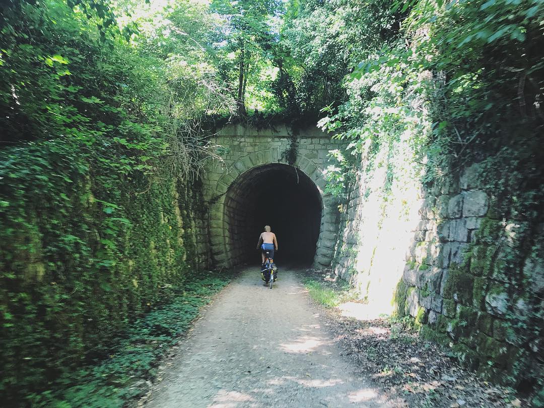 In den Wäldern zirpen die Vögel und summen die Zikaden. Wir treffen fast niemanden, rauschen in Ruhe über hellen Schotter, genießen die warme, duftende Luft und folgen der verschnörkelten Parenzana. Dadurch entdecken wir kleine Dörfer und kleine Städte, finden unser gemeinsames Tempo, ich singe komische Lieder, er lässt den Anhänger lustig hüpfen. Unsere erste Rast machen wir auf einem offiziellen Radrastplatz, zu dem wir über einsame asphaltierte Landstraßen gelangt sind. Davor hatten wir die Grenze hinter uns gebracht und waren mit viel zu vielen Autos einen Anstieg hochgeklettert. Die Sonnencreme zücken wir recht früh, denn es wird warm und heiß. Nach der ersten Rast wird es ruhiger und wir biegen auf Schotterpfade ab – hier kommen baufällige Eisenbahnbrücken, dunkle, nasse Tunnel und wir sagen der Zivilisation erst mal „Servus“.