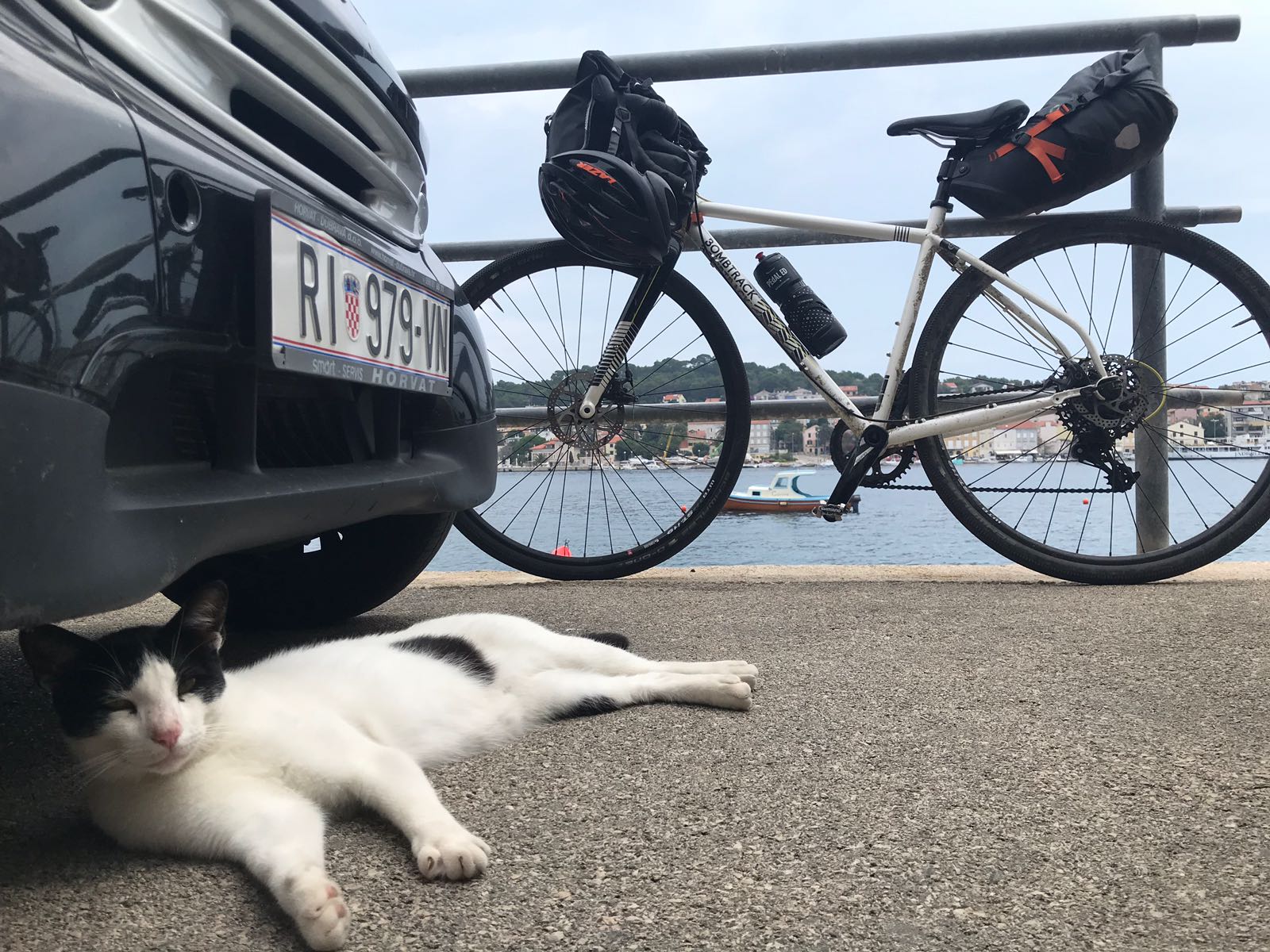 Der zweite Tag bricht an. Wir packen alles, ich mit Routine, er noch etwas mit Hindernissen. Wo muss was hin, wie ist das am besten. Nach einem Frühstück besprechen wir die Route und entscheiden, dass wir rüber ans Meer düsen, um mit der Fähre nach Cres überzusetzen. Gesagt getan: Wir fetzen tatsächlich die kurzen 60km oder so von VIzinada nach Brestova. Dort war die Fähre gerade abgefahren, also legten wir uns nachdem wir Tickets ergattert hatten auf den warmen Asphalt im Schatten und schliefen eine Runde.